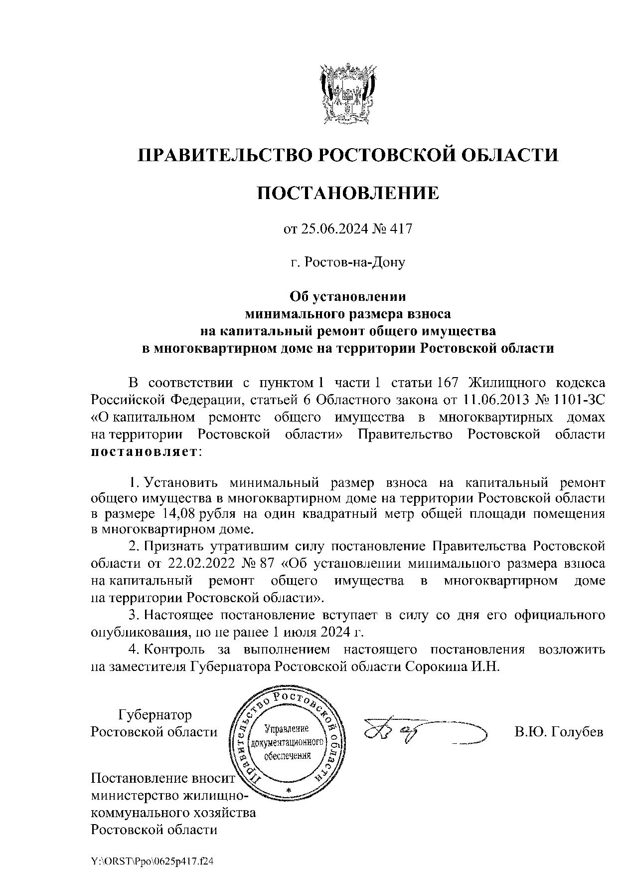 Постановление правительства Ростовской области от 25.06.2024 г. №417 "Об установлении минимального размера взноса на капитальный ремонт общего имущества в многоквартирном доме на территории Ростовской области" с 01.07.2024 г.